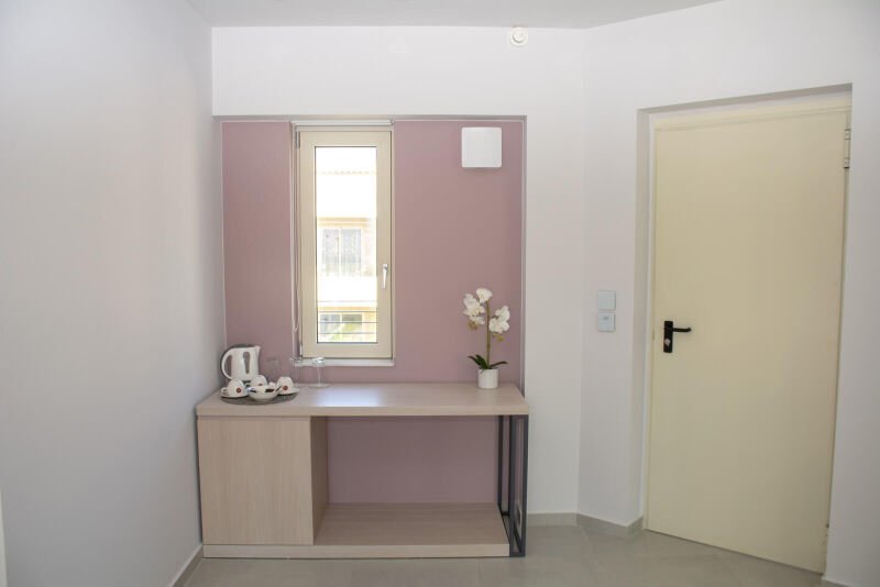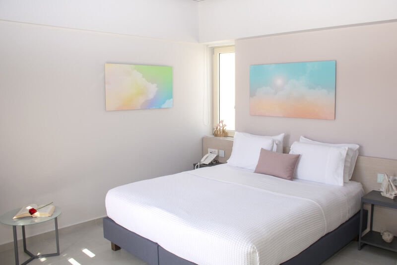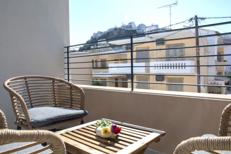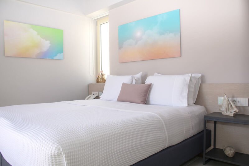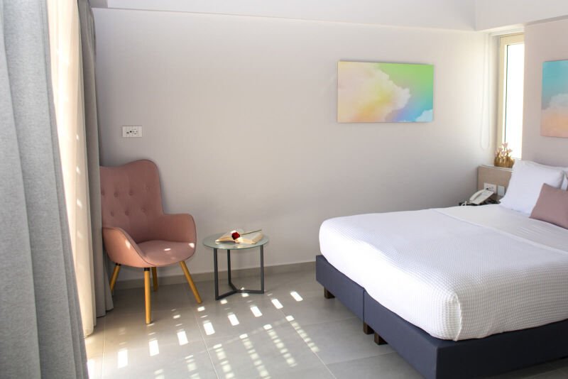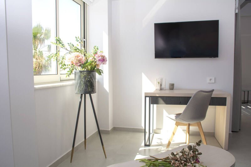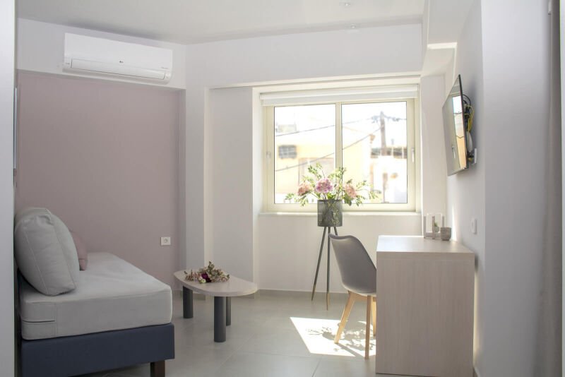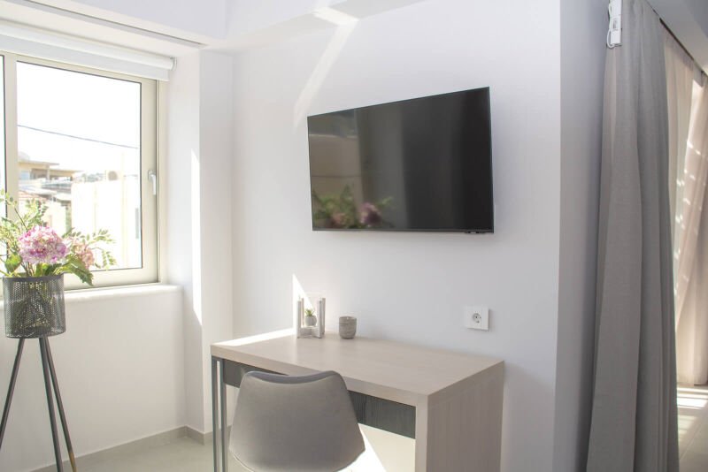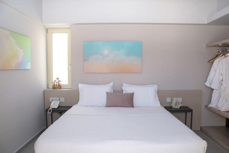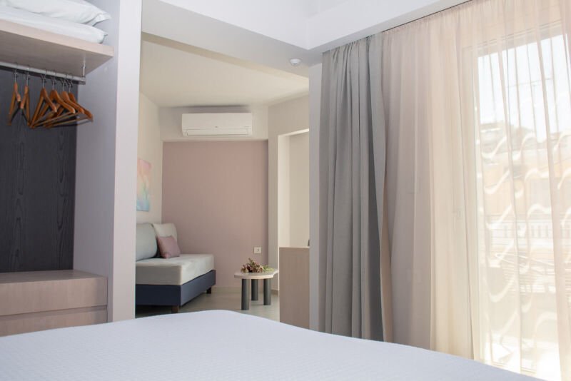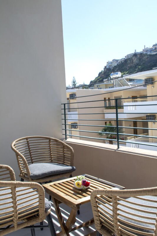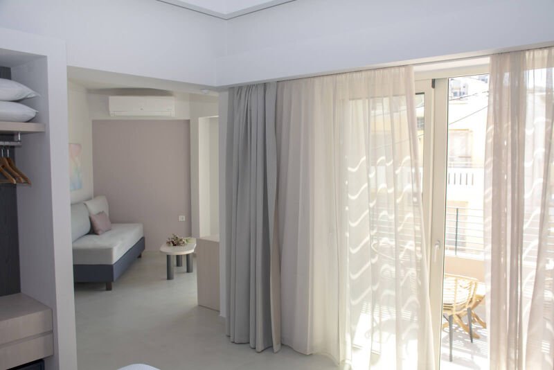 Indulge in the urban charm of our “Junior Suite with Balcony” at Melina Boutique Hotel. This 40sqm suite is a perfect retreat for three guests, featuring a comfortable queen-size bed and a convenient sofa bed. The suite’s balcony offers a captivating city view, allowing you to soak in the vibrant atmosphere of Platanias. With its spacious layout and modern amenities, this suite is a haven for relaxation and an ideal base for exploring the local sights.