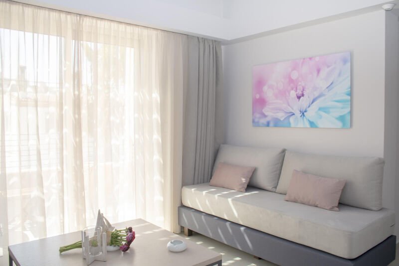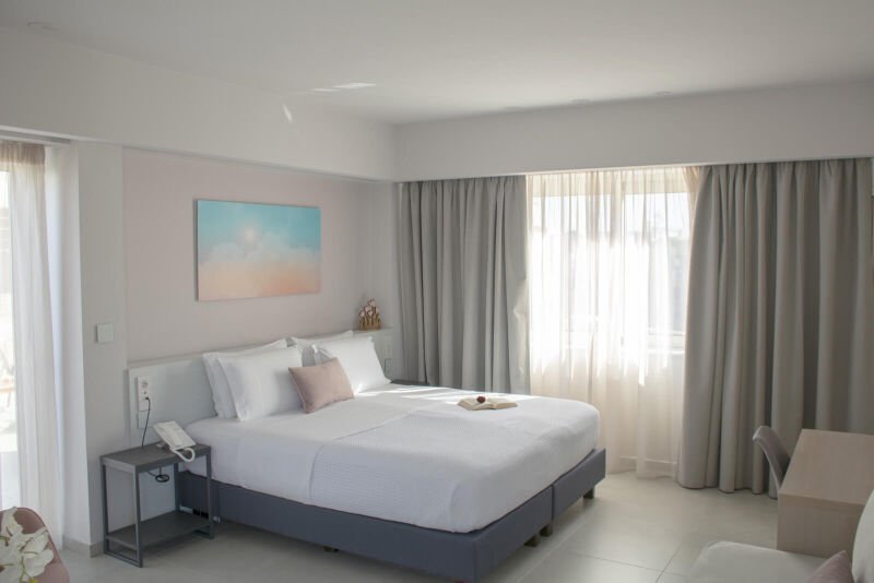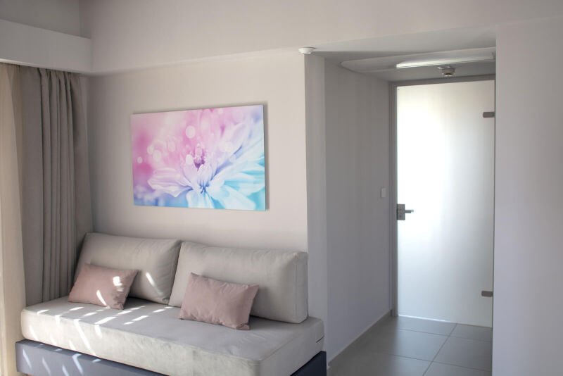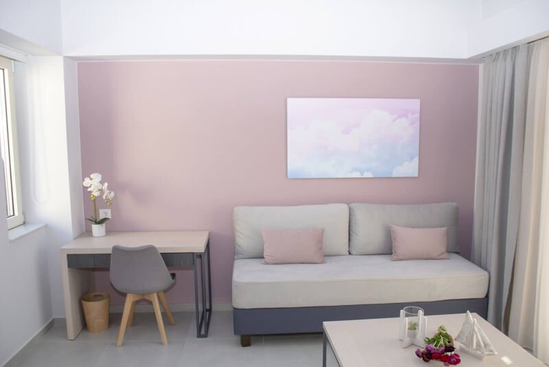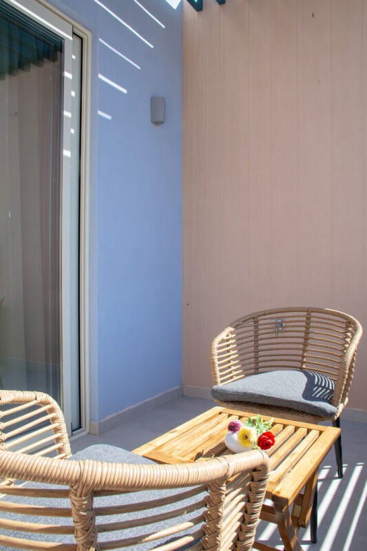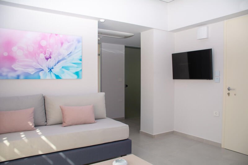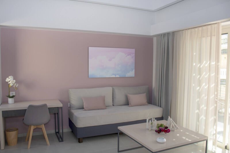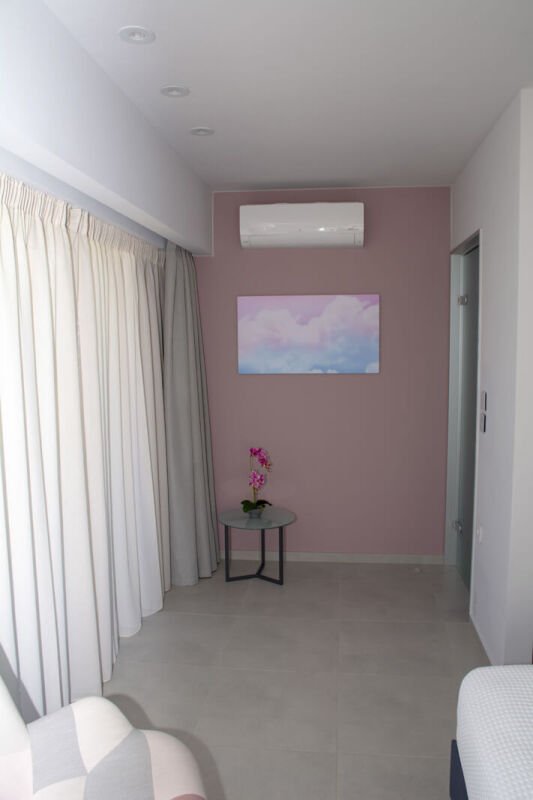 Experience the spacious luxury of our “Suite with Balcony” at Melina Boutique Hotel, designed to comfortably accommodate up to four guests. This 50sqm suite features a cozy queen-size bed and two inviting sofa beds, making it an ideal choice for groups. The suite’s balcony presents a stunning partial view of the sea, offering a serene setting to unwind and enjoy the beauty of Platanias. Whether you’re here to relax or explore, this suite provides the perfect blend of comfort and elegance for your stay.